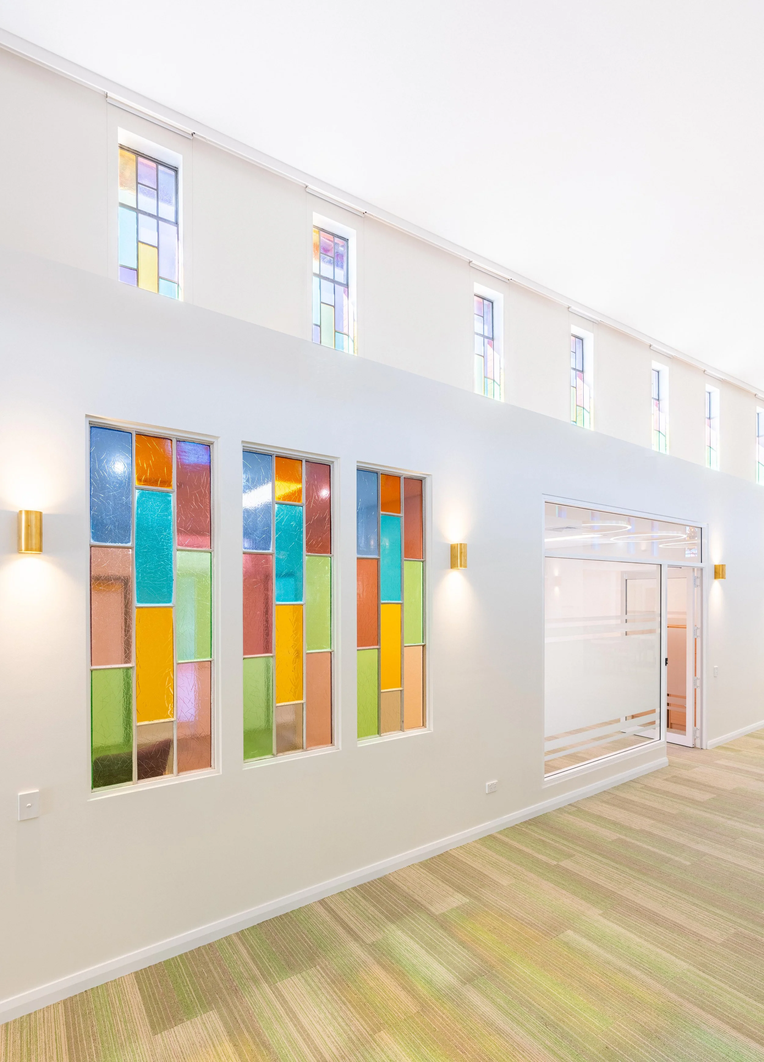 The office spaces are 'human-scale' insertions within the larger Chapel sanctuary that create a contrast with the conference rooms that embrace the dynamic 2 storey volume. The conference facilities remain grounded with flexible single storey breakout spaces and reading areas. The fitout includes state of the art technology to create an interactive, forward thinking venue and work space.